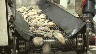 泡洗浄機-剥き身されたかきは泡洗浄機でかき殻など取り除かれる。
